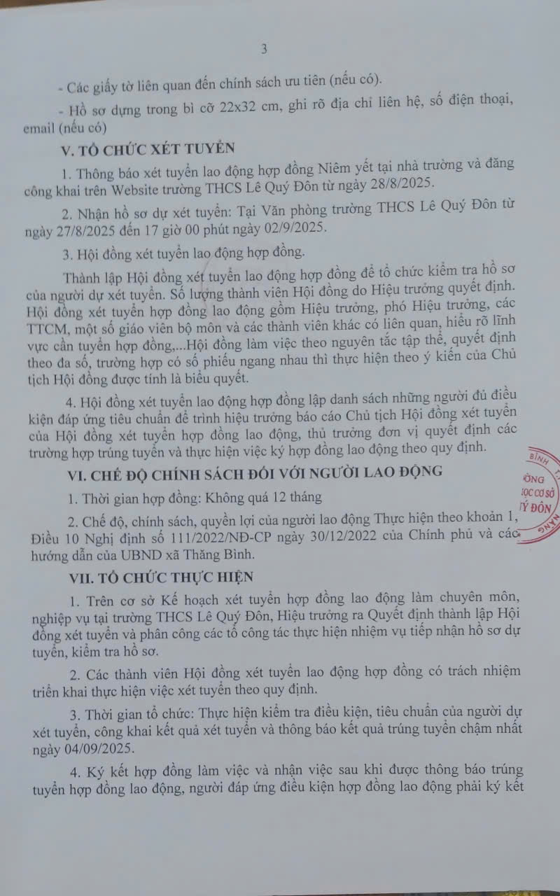 Kế hoạch Tuyển dụng hợp đồng lao động giáo viên năm học 2025 – 2026 Posted on 29/08/2025 by Trường THCS Lê Quý Đôn z6956069966975_b88d672acfb71951ade5a97d559ec8b2.jpg (216 downloads) Xem thêm: ĐỀ KIỂM TRA CUỐI HỌC KỲ I_NĂM HỌC 2024-2025 Công khai hồ sơ chuyên môn nhà trường từ năm học 2023-2024 PHÂN CÔNG LAO ĐỘNG HKI_AD TỪ 01.11.2024 LỄ BẾ GIẢNG NĂM HỌC 2024 – 2025 LỄ KHAI GIẢNG NĂM HỌC 2024 – 2025 Bài viết cùng chủ đề: KẾ HOẠCH THÁNG 01.2026 CÁC VĂN BẢN QUY ĐỊNH VỀ DẠY THÊM, HỌC THÊM THÔNG BÁO THỜI GIAN TỰU TRƯỜNG NĂM HỌC 2025 – 2026 THÔNG BÁO VỀ VIỆC DỰ XÉT CÔNG NHẬN TỐT NGHIỆP THCS NĂM HỌC 2024 – 2025 Mô hình dân vận “Phòng ngừa, ngăn chặn ma túy xâm nhập học đường” CHI BỘ THCS LÊ QUÝ ĐÔN ĐẠI HỘI NHIỆM KỲ 2025 – 2027 Tuyên Truyền “Ngày thế giới tưởng niệm các nạn nhân tử vong do tai nạn giao thông” GIẢI BÓNG CHUYỀN HỘI KHỎE PHÙ ĐỔNG TRƯỜNG THCS LÊ QUÝ ĐÔN NĂM HỌC 2024-2025 KẾ HOẠCH CÔNG TÁC THÁNG 10.2024 LỄ KHAI GIẢNG NĂM HỌC 2024 – 2025 THÔNG BÁO THỜI GIAN TẬP TRUNG HỌC SINH NĂM HỌC 2024 – 2025 Phòng chống xâm hại người chưa thành niên trên môi trường mạng CHUNG TAY XÂY DỰNG TRƯỜNG HỌC AN TOÀN, HẠNH PHÚC CHO HỌC SINH Sinh Hoạt Kỉ Niệm 41 Năm Ngày Nhà Giáo Việt Nam (20/11/1982-20/11/2023) THÔNG BÁO THỜI GIAN TỰU TRƯỜNG NĂM HỌC 2025 – 2026 LỄ KHAI GIẢNG NĂM HỌC 2025 – 2026